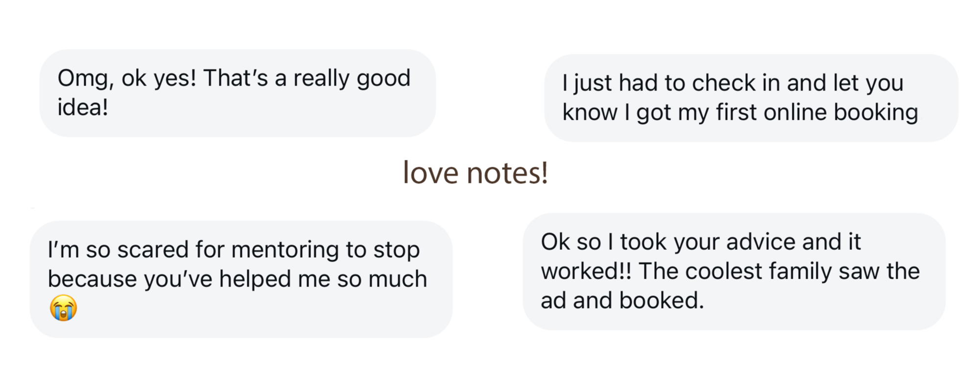 "I just saw your response on my Instagram story, I cannot believe that those minis are almost booked out! I did not think they would but they did. I just had to to keep talking about them and make it easier for people to book. Thank you!"